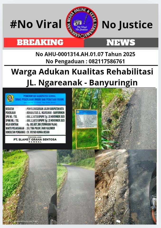 Kendal, (GMOCT) Suarakitanews.co.id – Pekerjaan rehabilitasi Jalan Ngareanak – Banyuringin di Kecamatan Singorojo, Kabupaten Kendal, yang dikerjakan oleh kontraktor PT Slamet Graha Sentosa Kendal dengan konsultan pengawas CV. Irsyad Kurnia Design, menjadi sorotan setelah diadukan oleh warga kepada awak media pada Selasa (16/12/2025).